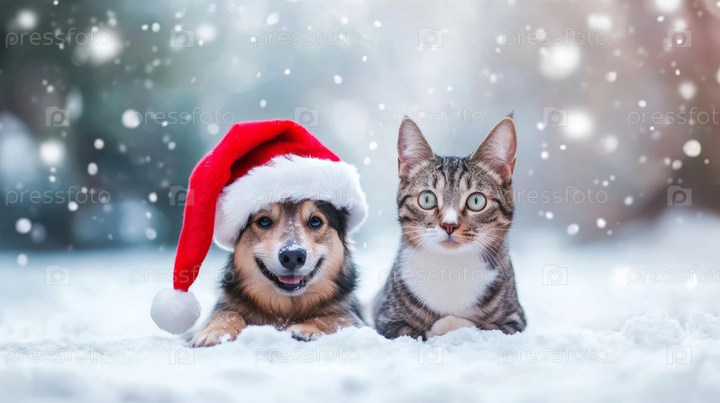 Волшебная рождественская счастливая собака и кошка в рождественской шляпе в рождественской белой фее