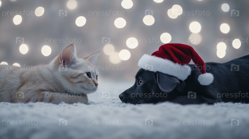 Волшебная рождественская счастливая собака и кошка в рождественской шляпе в рождественской белой фее