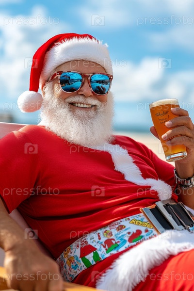 Дед Мороз летом сидит на шезлонге на пляже и держит пиво. Он носит классическую одежду Санта-Клауса, солнцезащитные очки. На заднем плане изображен коричневый песок и белые облака в голубом летнем небе