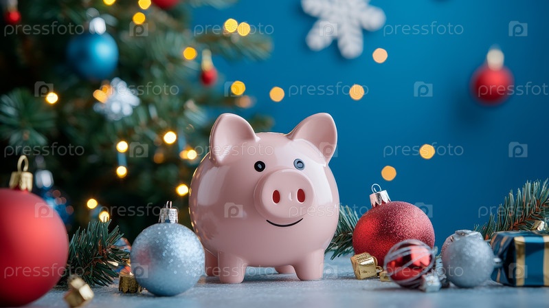 Веселая копилка с красочными рождественскими украшениями, олицетворяющими экономию и дух праздника