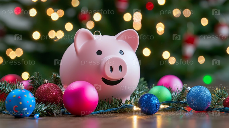 Пигги-банк, украшенный праздничными украшениями, окруженный прекрасными праздничными украшениями и мерцающими огнями