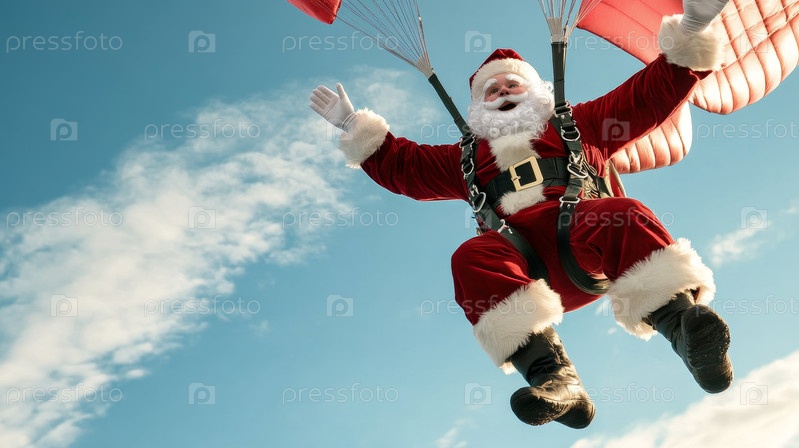 Санта-Клаус прыгает с парашютом с самолета