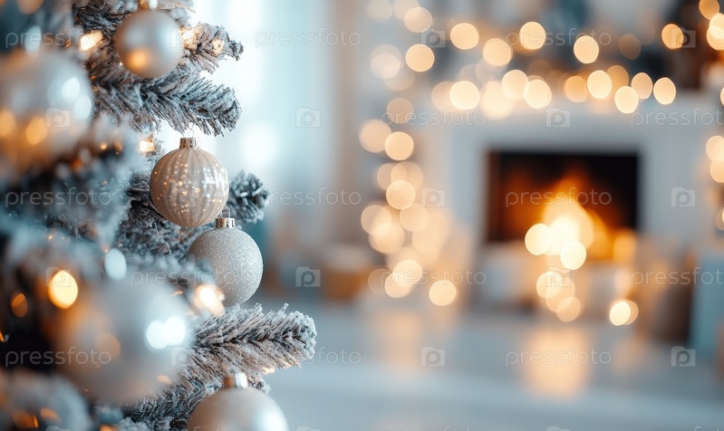 Украшенный Рождественская елка в уютной комнате возле камина,