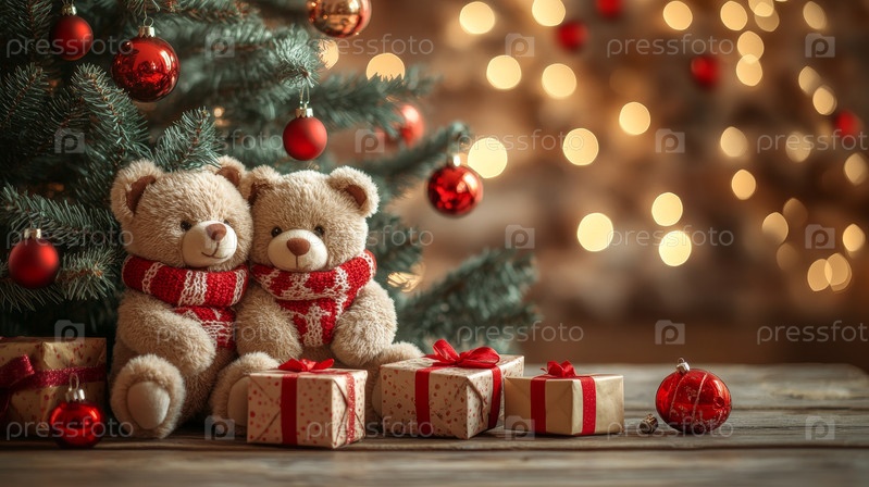 Любимые рождественские медведи украшены красочными праздничными украшениями и радостными подарками, чтобы отпраздновать этот особый сезон