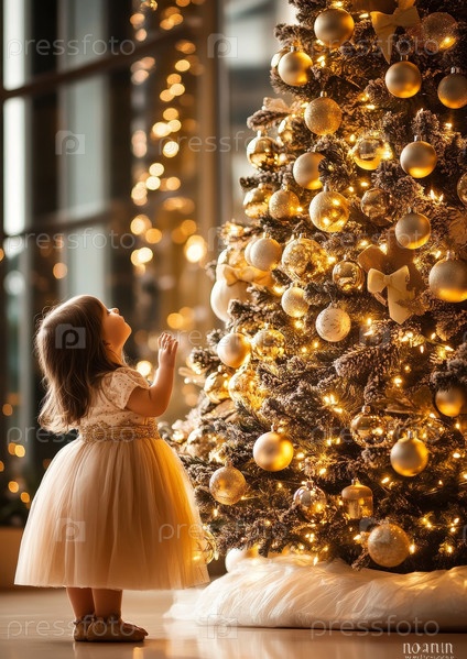 Очаровательный, веселый ребенок радостно украшает ослепительную рождественскую елку красивыми блестящими украшениями