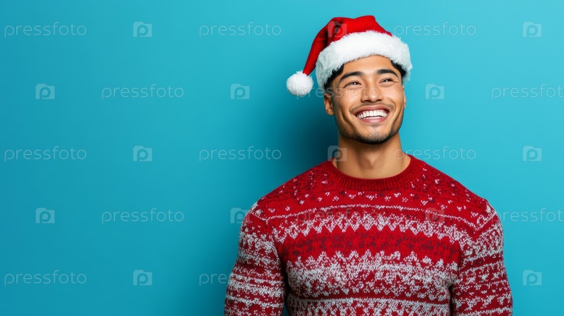 Праздничные улыбки человека, радостно носящего рождественскую шляпу и свитер, распространяющего праздничное веселье и радость