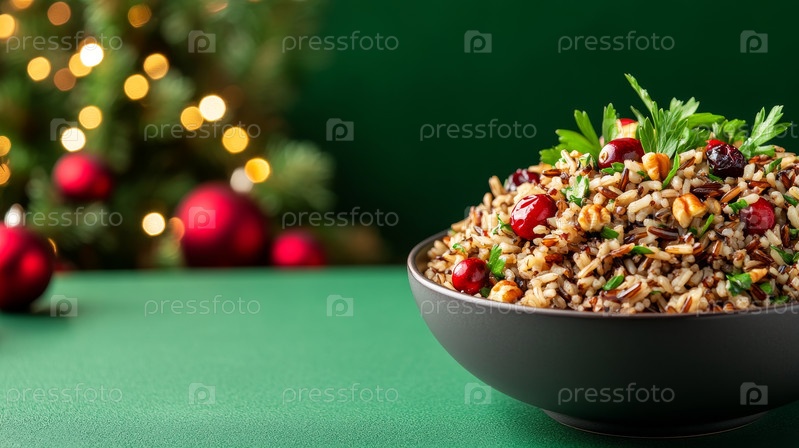 Вкусный праздничный салат из дикого риса с свежими красными ягодами и зеленым горохом, идеально подходит для отдыха