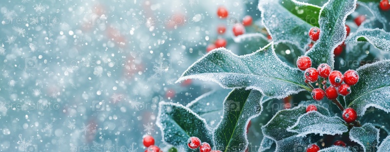 Зимний отдых Карта: Замороженные листья Холли и красные ягоды на снежном фоне
