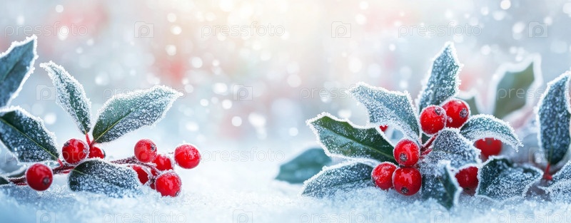 Зимний отдых Карта: Замороженные листья Холли и красные ягоды на снежном фоне