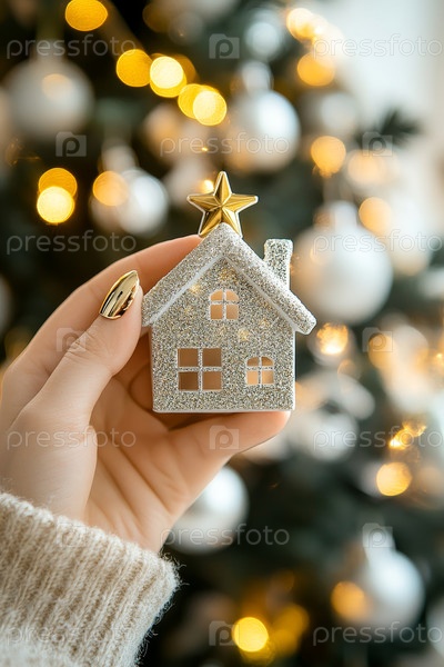 Рука, красиво держащая праздничный рождественский орнамент, который висит на украшенном дереве неподалеку