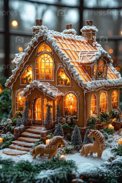 Хлебный дом, светящийся теплыми огнями, обледеневшая от снега крыша, миниатюрные сосны, печенье северного оленя, звездное печенье, окна при свечах, порошкообразный сахар