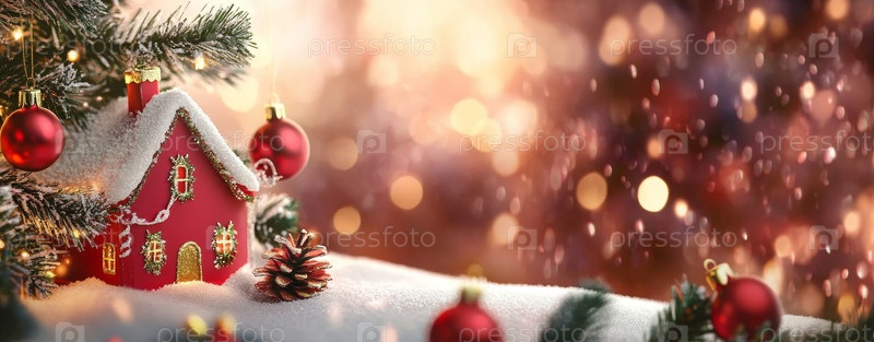 Красная капуста на заснеженном переднем плане, коттедж и теплые боке огни, миниатюрный дом, сосновые веточки с ягодами, праздничная ностальгия, идеально подходит для сезонного повествования