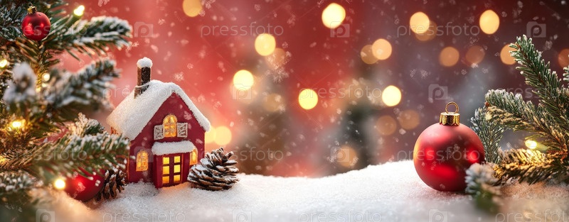 Красная капуста на заснеженном переднем плане, коттедж и теплые боке огни, миниатюрный дом, сосновые веточки с ягодами, праздничная ностальгия, идеально подходит для сезонного повествования