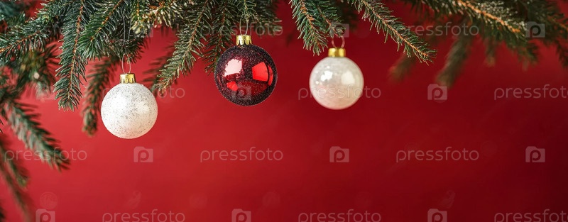 Три красных орнамента, висящих на пихте, глянцевые отражения на глубоком красном фоне, мягкое студийное освещение, минималистская элегантность, подходящая для баннера или социального