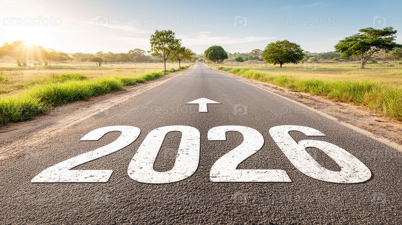 Открытая дорога, ведущая к 2026 году, восход солнца на горизонте с теплым светом, длинный прямой асфальт с окрашенными стрелками и цифрами, сухие поля и разбросанные деревья