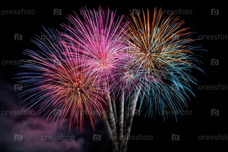 Красочные фейерверки лопнули над ночным небом, разноцветные хризантемные раковины с сверкающими тропами и дымчатыми шлейфами, высококонтрастный темный фон, праздничный