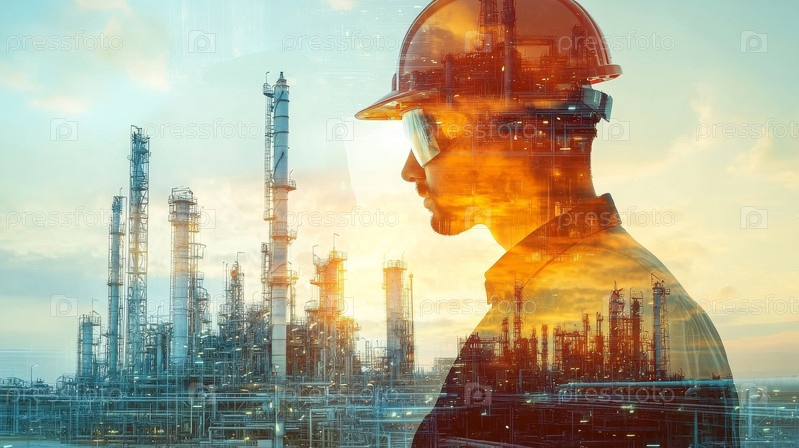 Силуэт инженера с промышленным ландшафтом, символизирующий инновации и сотрудничество