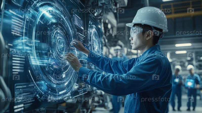 Высококвалифицированный техник взаимодействует со сложной голографической технологией в передовой лаборатории