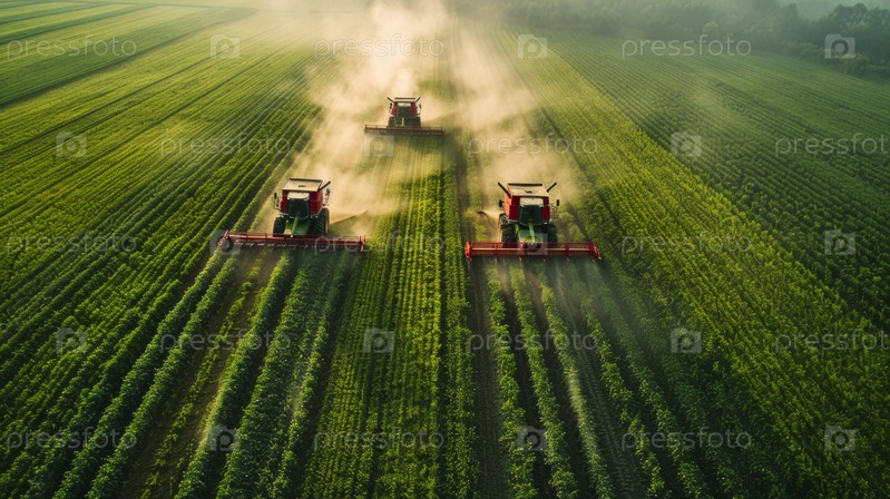 Два современных трактора собирают урожай в пышном поле во время золотого восхода солнца, демонстрируя сельскохозяйственные инновации