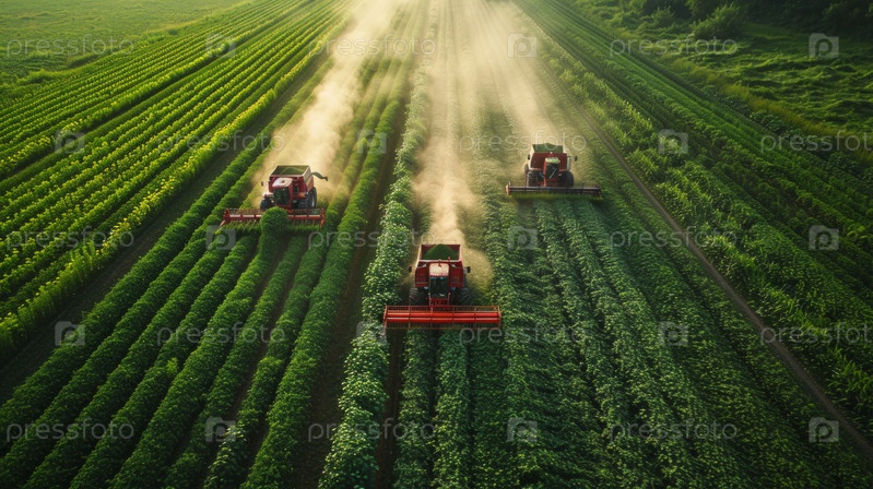 Два современных трактора собирают урожай в пышном поле во время золотого восхода солнца, демонстрируя сельскохозяйственные инновации