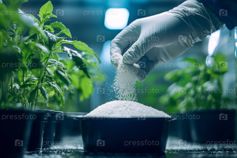Подробный крупным планом рука в перчатке умело применяет необходимые питательные вещества к молодым растениям, растущим в горшках