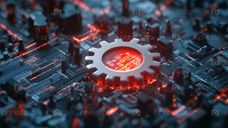 Футуристический Gear Icon отображается на фоне Circuit Board с яркими неоновыми цветами и дизайном