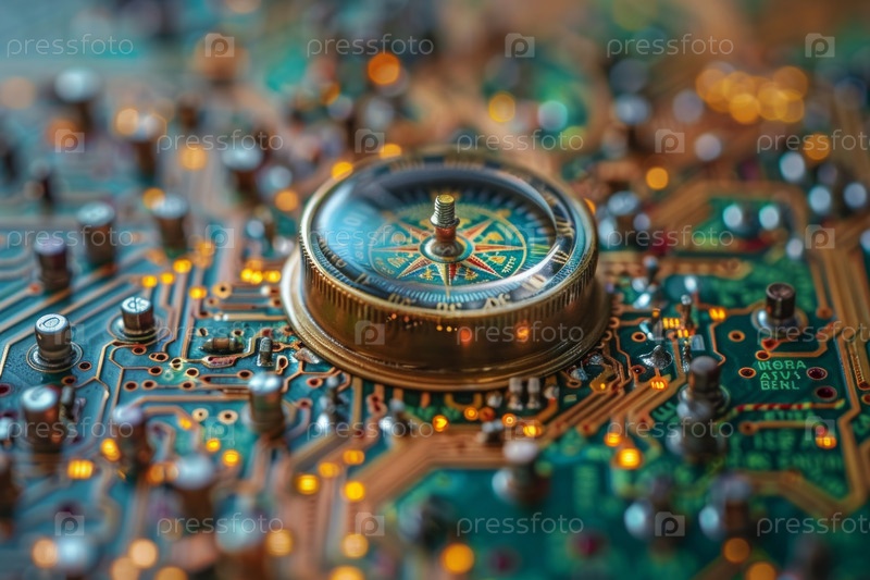 Захватывающий старинный компас, покоящийся на детализированной печатной плате, символизирующий навигацию в мире, управляемом технологиями