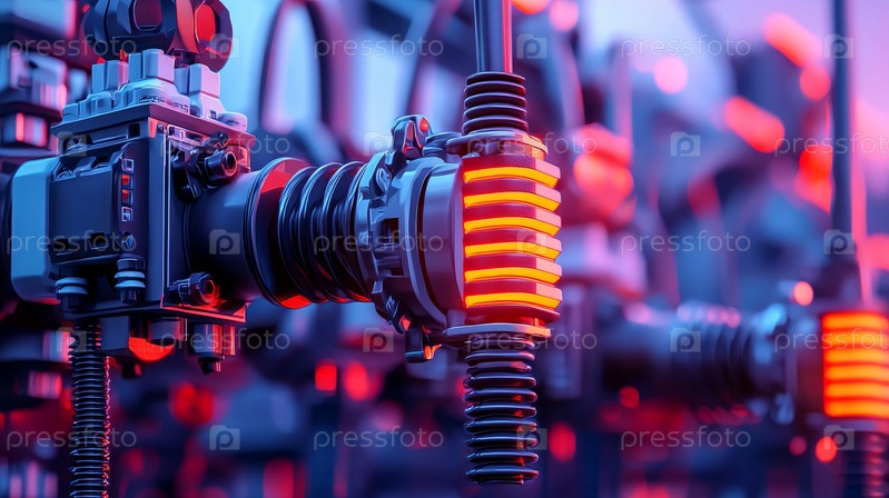 Освещенные линии электропередачи в сумерках Подробный обзор электрической инфраструктуры среди сумеречного неба