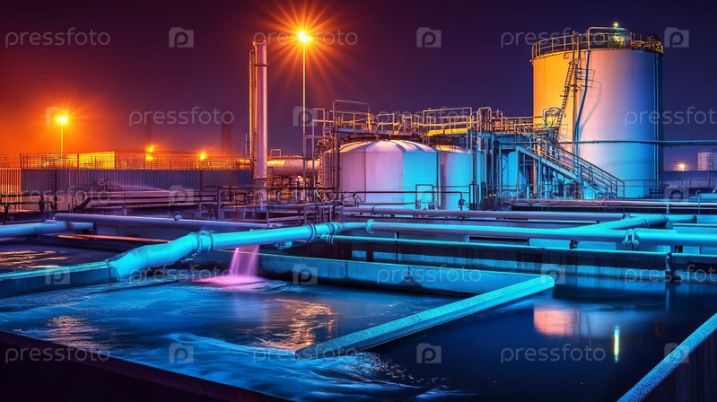 Освещенный промышленный завод ярко светит ночью, красиво отражаясь на спокойной водной поверхности
