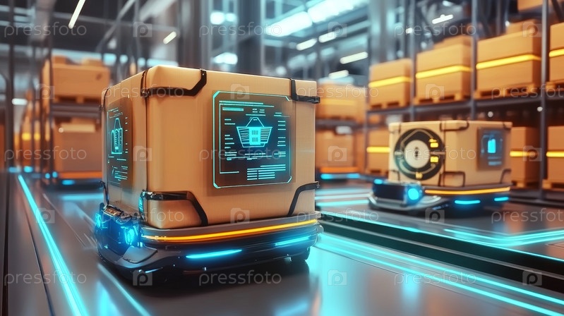 Автоматизированные розничные складские роботы AGV с инфографикой доставляют картонные коробки