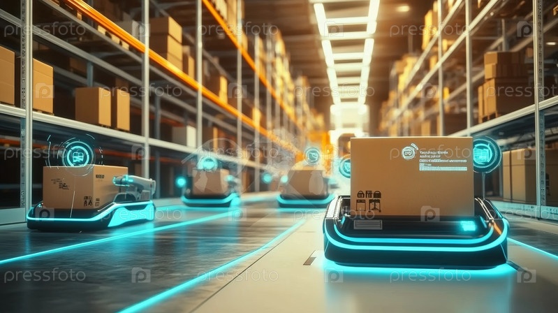Автоматизированные розничные складские роботы AGV с инфографикой доставляют картонные коробки