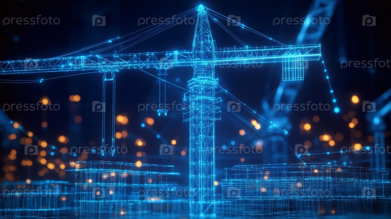 Футуристический цифровой строительный кран в ярком стиле Blue Neon, символизирующий передовые инновации и технологии