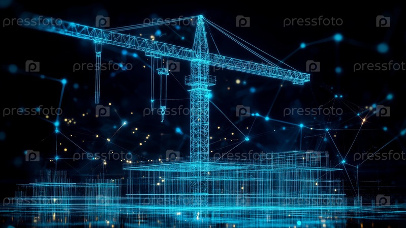 Футуристический цифровой строительный кран в ярком стиле Blue Neon, символизирующий передовые инновации и технологии