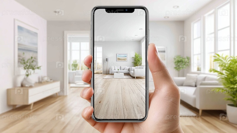 Ручной держа смартфон, показывающий яркий интерьер гостиной с дубовыми полами, большими окнами, нейтральным диваном, горшечными растениями, постановочным наложением для напольных покрытий