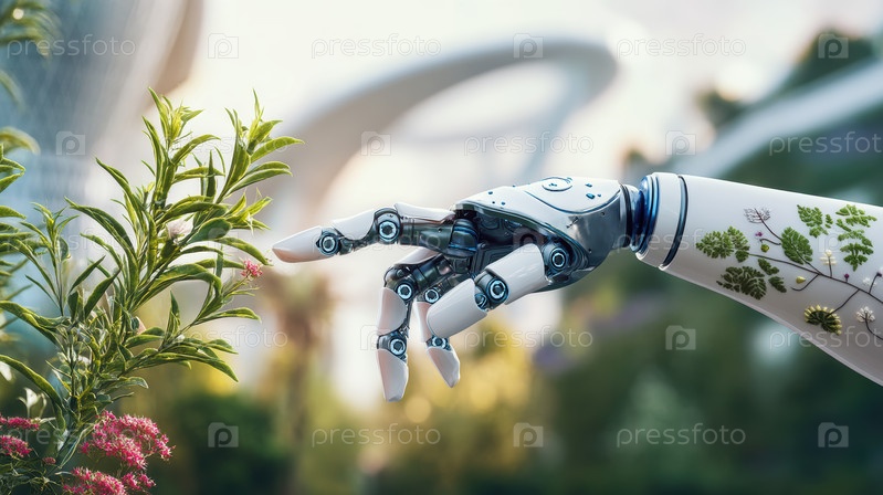 Роботизированная рука деликатно взаимодействует с прорастающим саженцем среди городского пейзажа, футуристическая роботизированная конечность мягко соединяется с человеческой рукой над растущим растением в городском саду