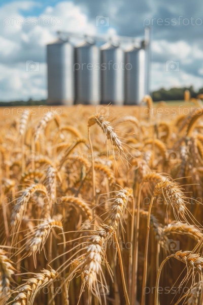 Силос в пшеничном поле, концепция сельскохозяйственного производства и хранения, золотое поле на заднем плане,