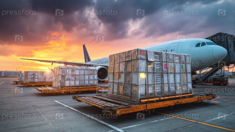 Великолепный грузовой самолет на закате загружен грузовыми пакетами, готовыми к транспортировке