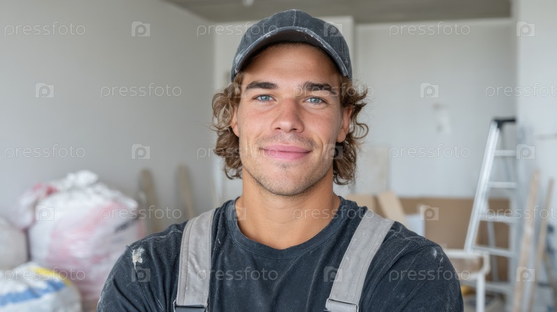 Веселый строитель стоит на месте ремонта, демонстрируя тяжелую работу и страсть к строительству