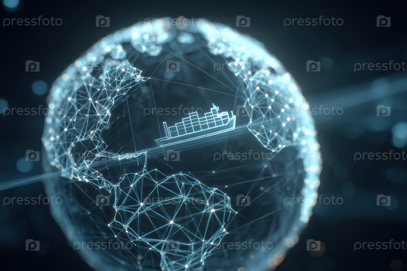 Гладкий каркасный глобус с динамическими точками слежения, показывающий один значок грузового судна, движущегося через оптимизированную для ИИ сеть цепочки поставок
