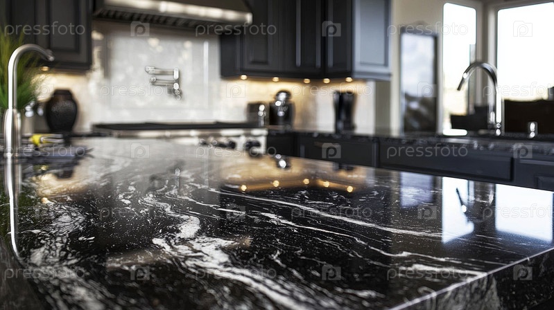 Современная кухня с изящным гранитным островом и различными элементами современного дизайна