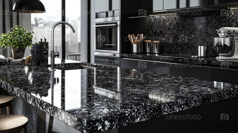 Современная кухня с изящным гранитным островом и различными элементами современного дизайна