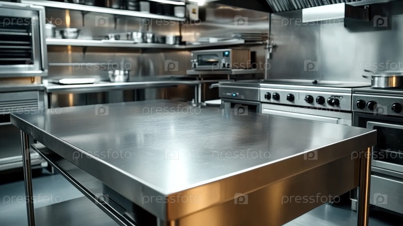 Коммерческий интерьер кухни с современным оборудованием из нержавеющей стали и различными рабочими станциями для повышения эффективности
