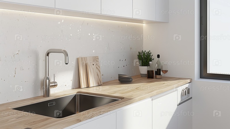 Белые стены, деревянные столешницы, раковина,