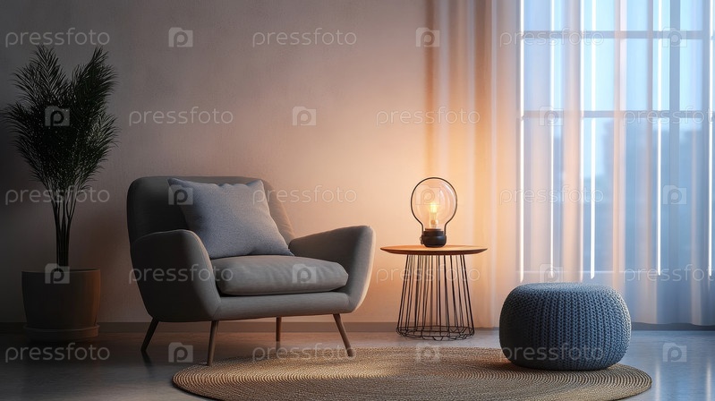 Теплое и привлекательное жилое пространство с уютным креслом, элегантной лампой и прекрасным растением для украшения
