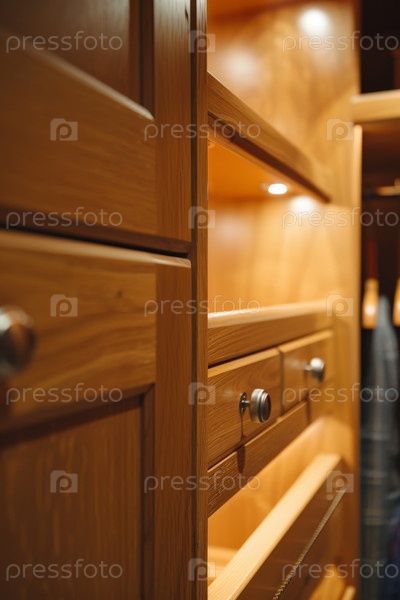 Угол элегантного гардероба, с висячими на одной стене и ящиками для хранения в светлом деревянном цвете