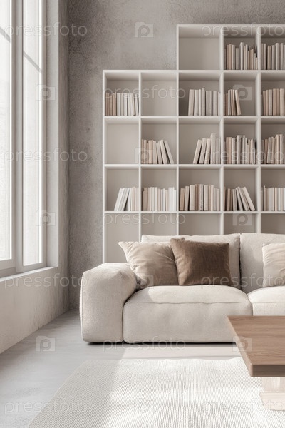 Современная минималистская гостиная со стильной книжной полкой и живописными видами, вдохновляющими на спокойствие и спокойствие