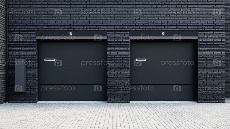 Современные черные гаражные двери дополнены текстурированными стенами и стильным бетонным дизайном пола