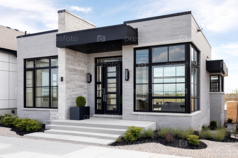 Современный бетонный фасад роскошного дома с высокими стеклянными окнами, дверью гаража с матовой панелью, геометрическим входом и каменной дорожкой. Минималистический ландшафт