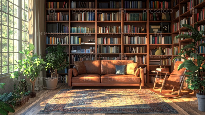 Уютная гостиная имеет большую книжную полку и пышные комнатные растения, идеально подходящие для теплого чтения