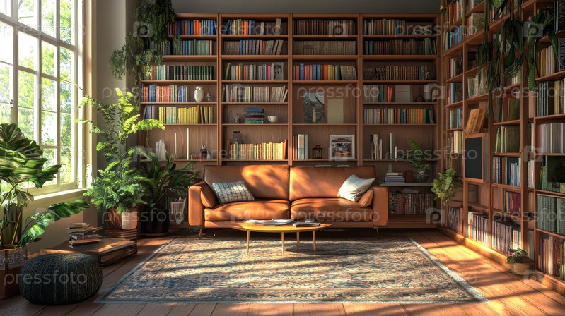 Уютная гостиная библиотеки с красивыми книжными полками и пышной зеленью для приятной атмосферы